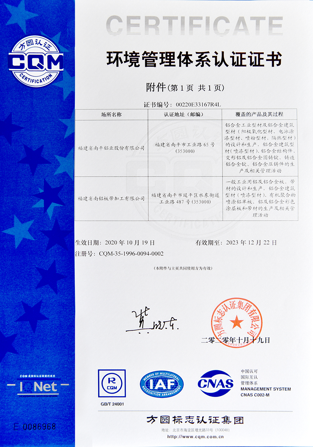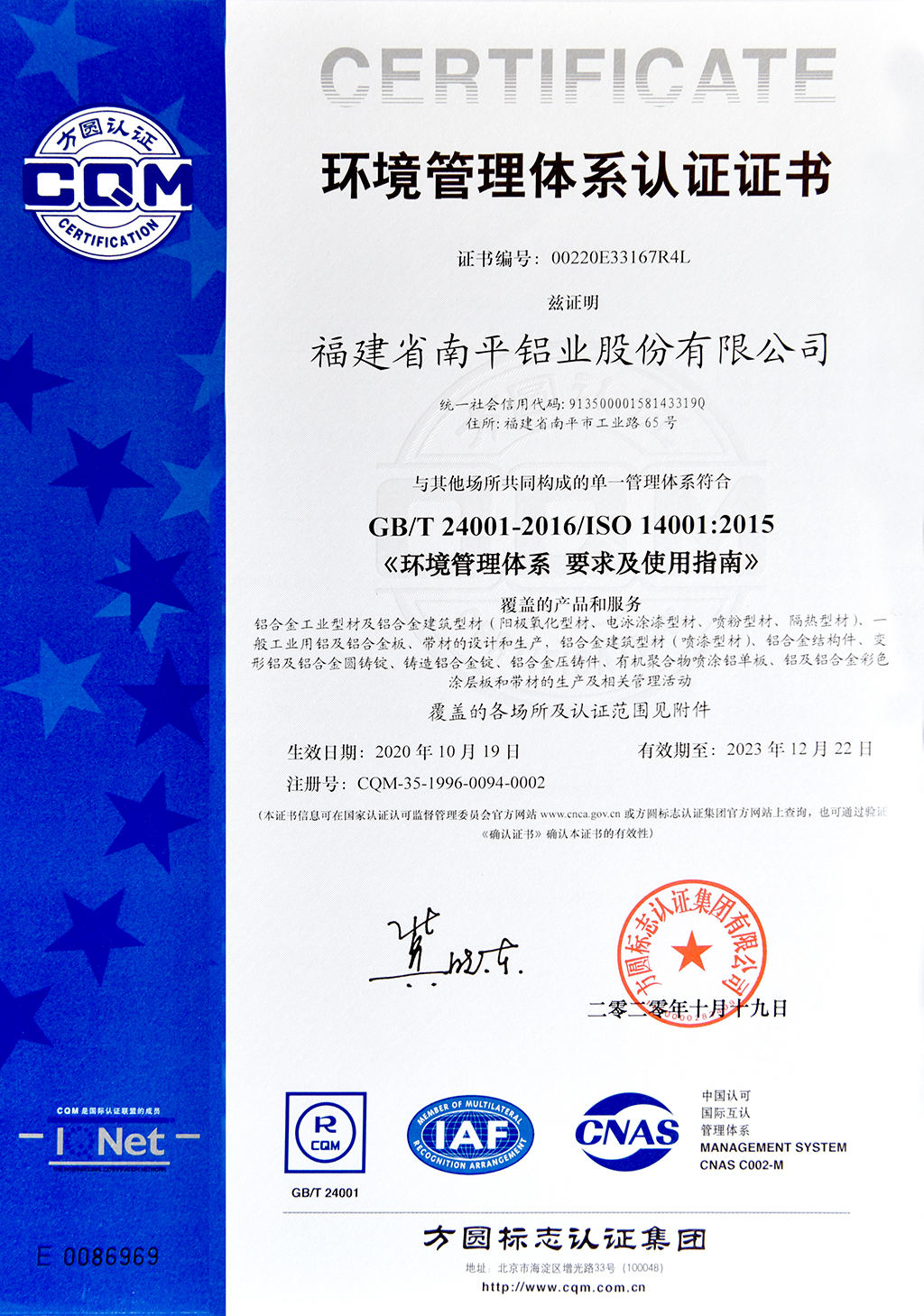 环境管理体系认证证书